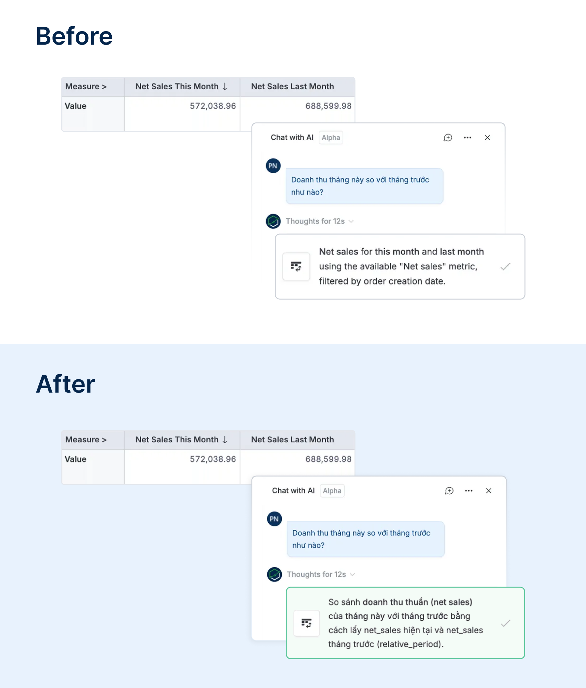 For example, if Revenue has predefined underlying views of Orders, Users and Products, AI can surface top canceled orders, churned users, or least-selling products when investigating a Revenue drop.