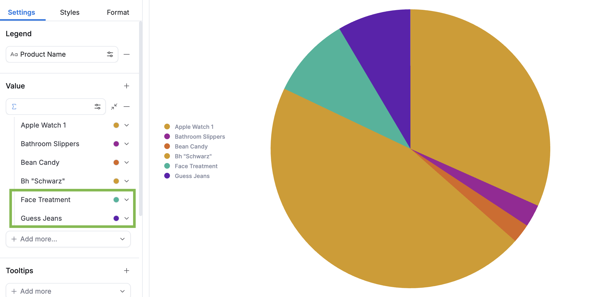 In this example, let's try to always show Face Treatment in green and Guess Jeans in purple.