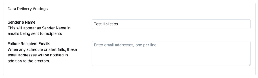 If for some reason, data schedule or data alert fails to run and deliver, the system will notify the following users via email by default: