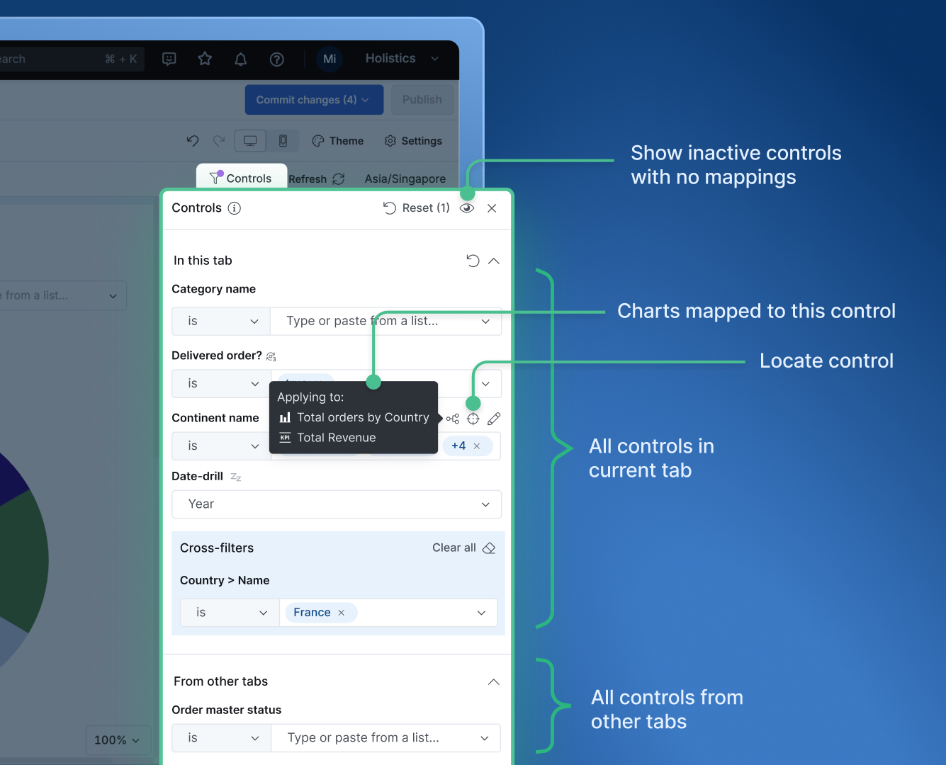 - Identify unmapped filters - Inactive controls with no mappings are displayed, helping you spot controls that need to be connected to visualizations.