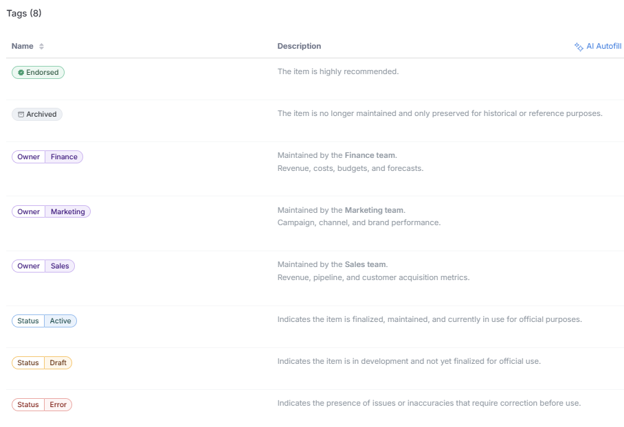 Tags help you efficiently categorize analytics content, allowing users to quickly discover related items through meaningful categories and labels.