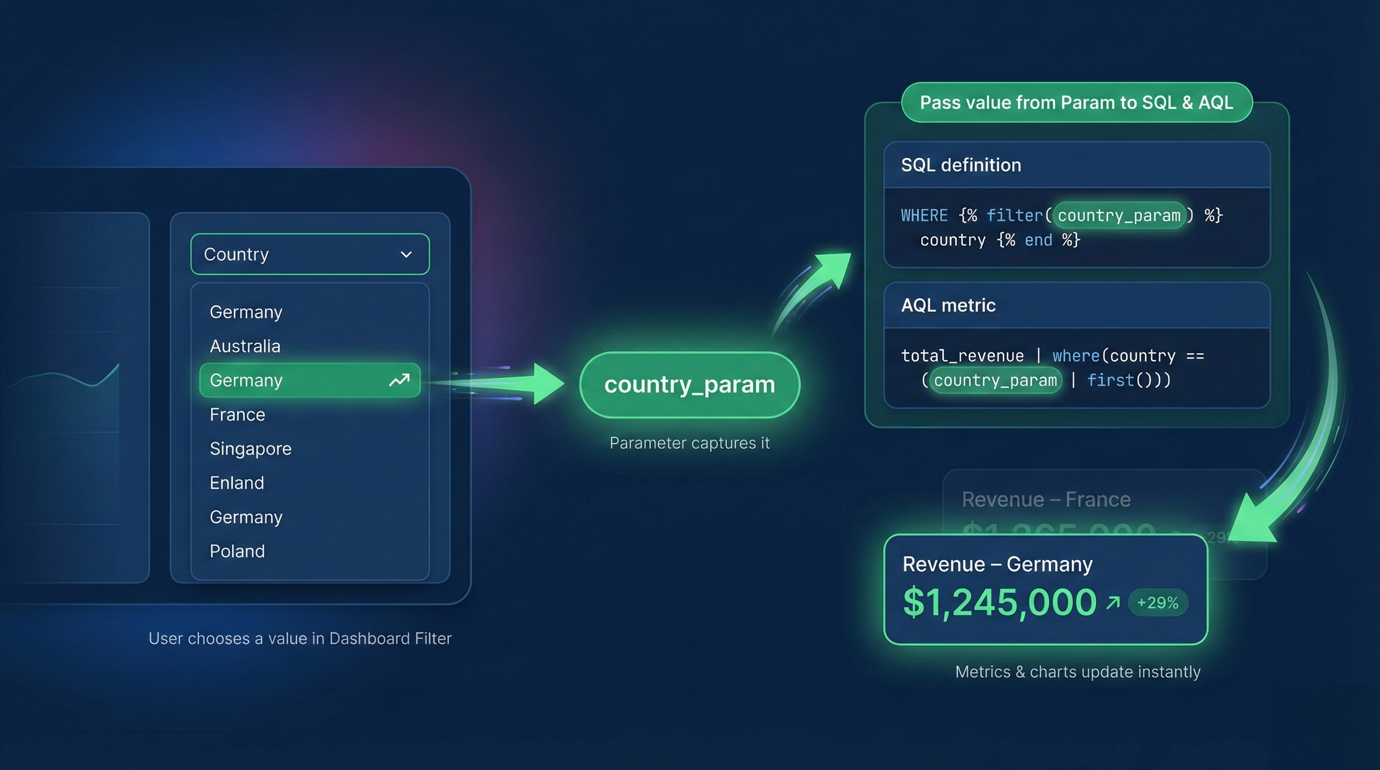 - Pass these values into your model's query definitions (SQL or AQL)